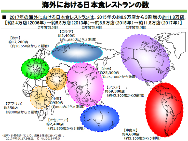世界の日本食レストランの数は、2006年には約2.4万店でしたが、2017年には約11.8万店まで急増。 2013年以降の増加は、和食がユネスコも世界無形文化遺産に登録されたことも一役買っていると言われています。