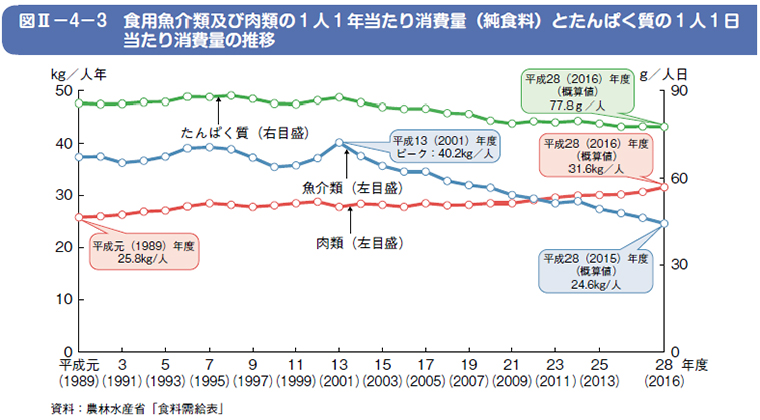 しかし、2011年に、一人当たりの一年で食べる肉類の量が魚介類の量を上回りました。