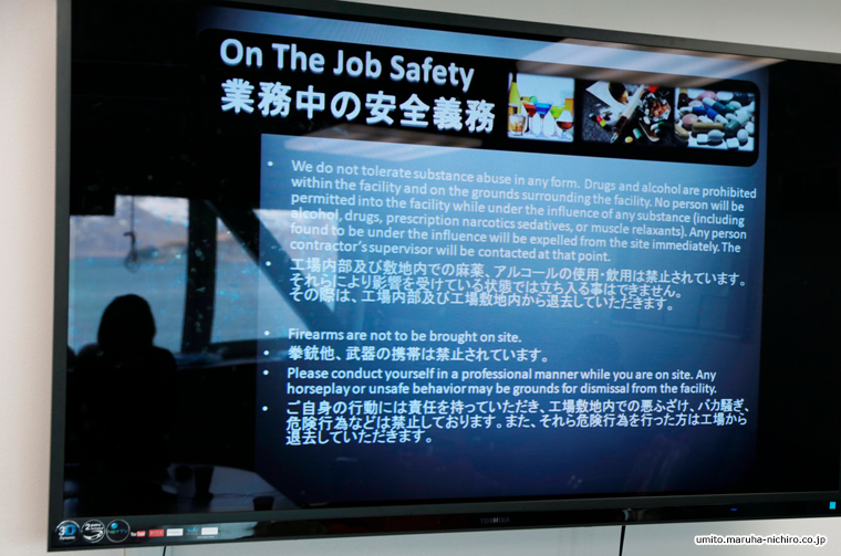 工場の中に入るには、衛生管理や業務中の安全業務などに関する説明と、厳しいチェックを受けます。
