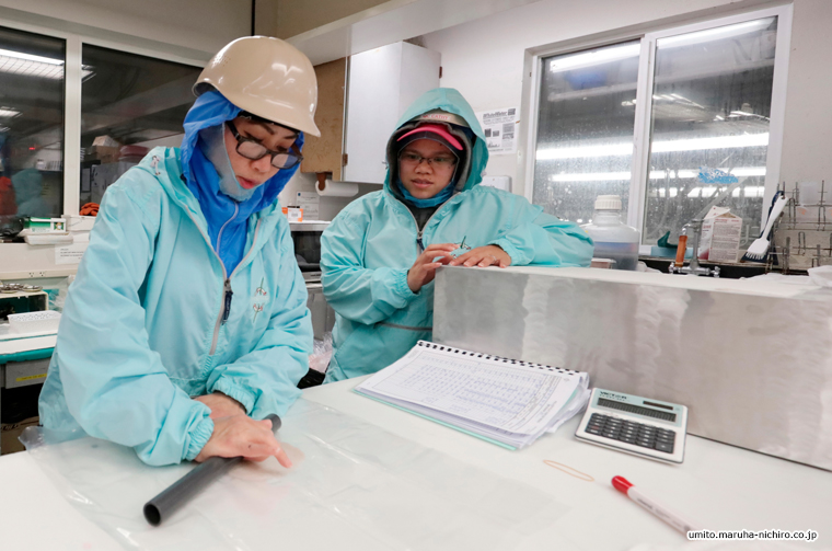 写真は、スリミの検品をしている時の様子です。