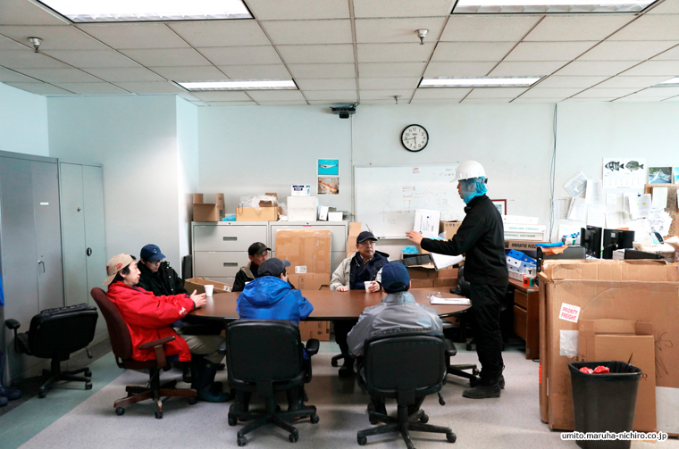 水揚げのハイシーズンになると、現地の社員と日本人駐在員と日本人技術者が連携してフル稼働しています。