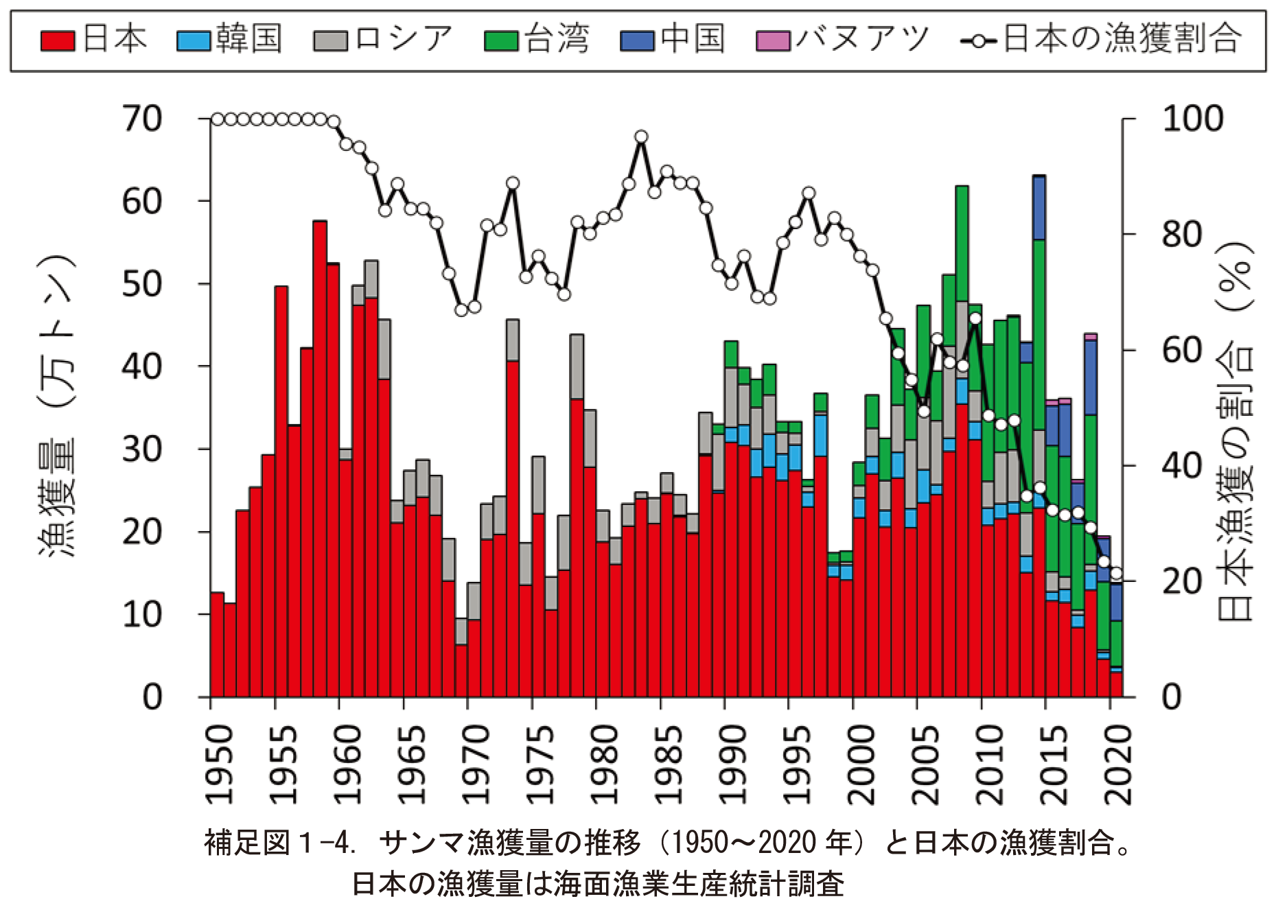 この2つのグラフと図から分かることは、日本の漁場の外側の公海でも、サンマの資源が減少傾向であることが分かります。つまり、日本への来遊前に外国漁船に漁獲されてしまうということだけでなく、すでに外国漁船が漁獲しているサンマ資源の漁獲量も減っている、非常に厳しい環境ということです。