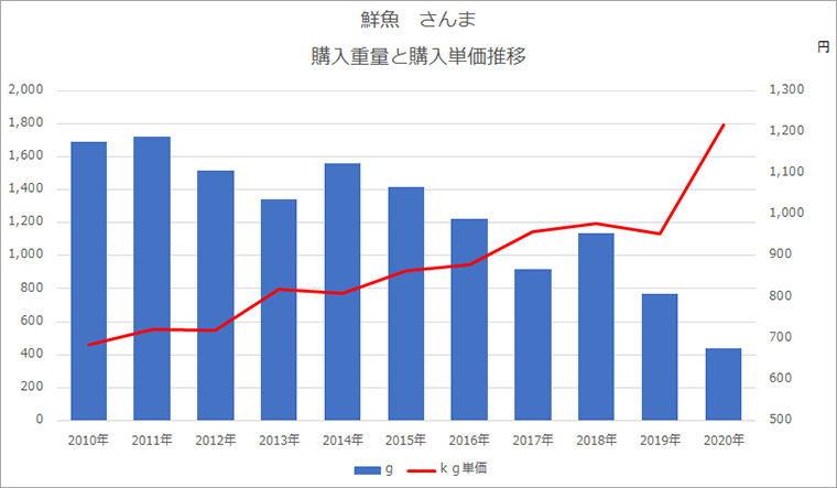 (鮮魚さんま 家計調査2人以上世帯 消費支出金額・数量(g)を編集)