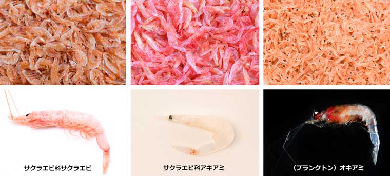 (左:サクラエビ科 サクラエビ 中:サクラエビ科 アキアミ 右:プランクトン オキアミ)