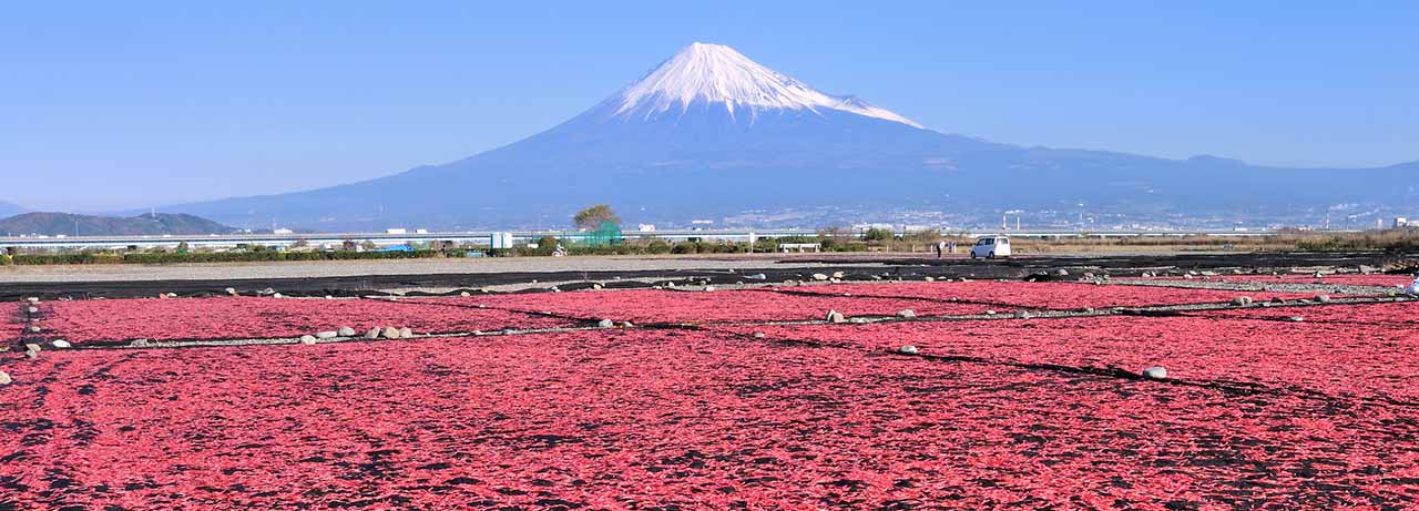 小さくても風味抜群で、美しい桜色が目にも鮮やかなサクラエビ、日本では静岡県駿河湾の由比港・大井川港だけで水揚げされる希少なエビです。天候の良い日、富士川の河川敷で天日干しされるサクラエビはまさにピンク色の絨毯。富士山を背景にした圧巻の光景です。