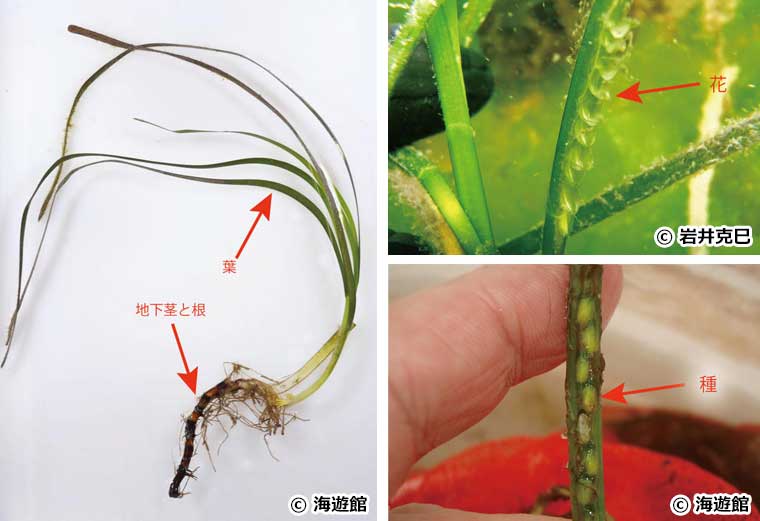 アマモは海草の一種。花を咲かせ種子によって繁殖するイネ科の種子植物で、根・茎・葉の区別があり、胞子で増えるノリなどの海藻とは異なります。