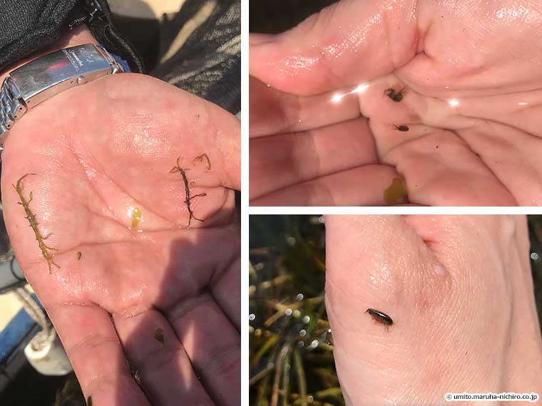 海中に手を入れている間は気にならなかったのですが、海から手を上げてみると、こそばゆい感触がありました。見てみると、何の生き物でしょうか?小型の甲殻類のワレカラでしょうか?アマモを触ったときに一緒に採取してしまったようです。