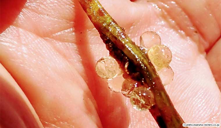 魚の卵と思われるものも見つけました。現地の漁師さんの見立てでは、ダツという魚の卵だそうです。