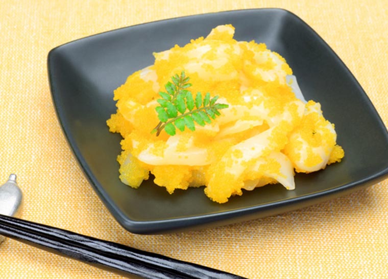 黄金イカはスーパーの鮮魚コーナーに置いてあることも多いので、見たことがある方もいらっしゃるのではないでしょうか。イカの細切りにニシンやシシャモの魚卵を加えた料理で、イカの白さと魚卵の黄色が目にも鮮やかな逸品です。