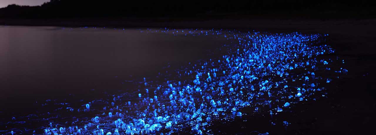 暗闇に浮かぶ、神秘的な青い光――富山湾滑川近くの浜では、毎年3月~5月頃になると“ホタルイカの身投げ”と呼ばれる現象がしばしば見られます。普段は沖合の深海にすむホタルイカが、産卵のために浅瀬の海面近くまで上がり、浜に打ち上げられて発光する壮観な光景です。