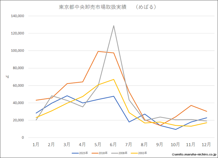 では「漁獲の旬」はどうでしょう。豊洲ほか、多くの市場では春から取引量が増えだし、6月にピークを迎えています。