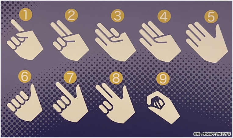 せりは「手やり」と呼ばれるサインを用いて行われます。買い手が購入したい品物の値段や数量を指で示し、せりを行う人は、たくさんの買い手が示す指のサインを見定め、一番高い値段を示した人を指名することで、落札者を決定します。