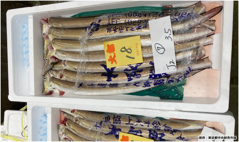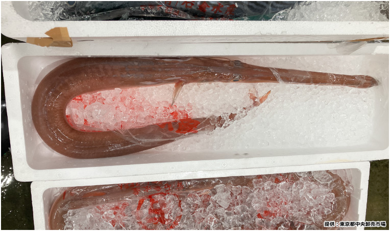 窮屈そうに収まっているのはスーパーではなかなか見かけないアカヤガラ。1mほどの細長い体で、1/3が頭部を占めており、口が長く紐状の尾をもつ変わった見た目です。食べ方は、刺身、塩焼きはもちろんのこと、美味しい出汁が出るため和食の椀物などに使われています。
