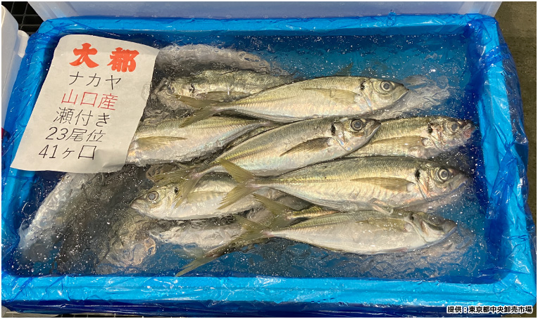こちらは瀬付きのアジです。今にも群れて泳ぎだしそうです。アジには2パターンあり、回遊しているアジと瀬に集まっているアジがあります。瀬付きのアジは瀬に居ついているため、エサをたっぷり食べ、脂がのってふっくら肉厚。市場に訪れた日は満月の時期でしたので、まき網漁はお休みで、瀬付きのアジが出回っているとのこと。満月にアジの巻き網漁を行わない理由は、満月だと夜でも明るく、集魚灯が効かないため、まき網漁はお休みするようです。