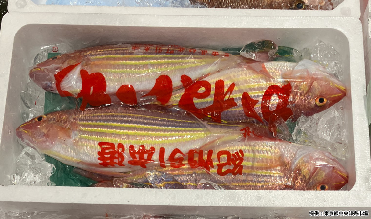 タイという名前の魚が続きますが、次はイトヨリダイです。名前の由来は、赤と黄の筋状の模様があり、泳いでいるとき金糸を拠るように見えるからとのことです。