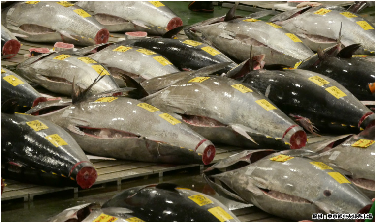 まずはマグロから見ていきましょう。訪問日の東京都中央卸売市場の日報を確認したところ、生鮮マグロは9.4tもの扱いがありました。北は北海道、南は沖縄の本マグロが100本以上並んでいました。ピカピカと黒光りした本マグロがずらっと並んでいる光景は圧巻です。