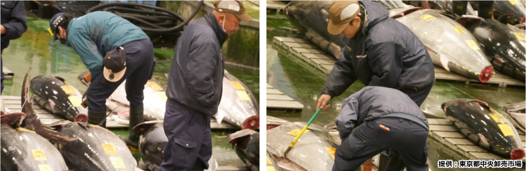本マグロは尾が切り取られていて、断面が見られるようになっています。せりに参加する仲卸業者は、尾の断面をチェックし、身の色・脂の乗り・身質(水分含量)から品質を判断しているとのことです。尾の断面が変色しないように、尾の部分を氷で冷やされているマグロもありました。このような工夫や配慮が適正な評価につながっているのでしょうね。また、尾以外にも、外観や腹の厚さなどを慎重にチェックしていました。