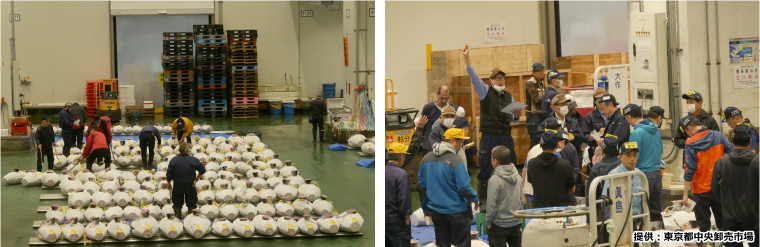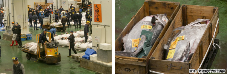(左:運搬車「ターレ」 右:木箱に入れられたマグロ)