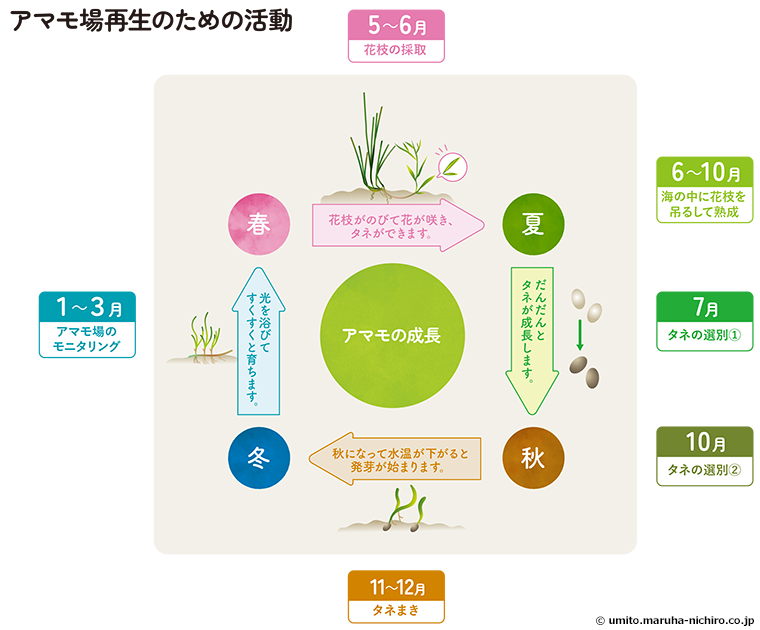 アマモの花枝とは、花を咲かせてタネを実らせるために春になるとのびてくる枝のことです。採取した花枝は袋にまとめて10月まで海の中に吊るします。周りの余分な茎や葉など(タネ以外の部分)が腐り、タネが熟成してから、7月、10月の2回に分けてタネの選別を行います。11月~12月に選別したタネを蒔きます。