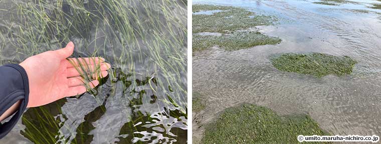 アマモに似たコアマモも多く見かけました。コアマモはアマモよりも小さく、成長しても10cmくらいの大きさにしかなりません。コアマモは潮が引いて海底が一時的に露出しても耐えられるので、アマモよりも浅い場所に生息することができます。