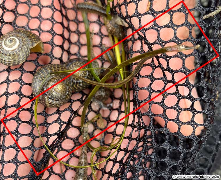 アマモに紛れて分かりづらいですが、よく見ると細長い魚がいるのが分かります。