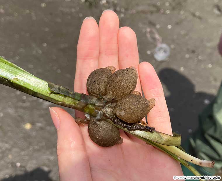 コウイカがアマモに卵を産み付けていました。このようにアマモ場は魚やイカが卵を産む場所のひとつです。アマモ場で生まれた稚魚などはアマモに守られながら成長していくので、アマモ場は「海のゆりかご」とも呼ばれています。
