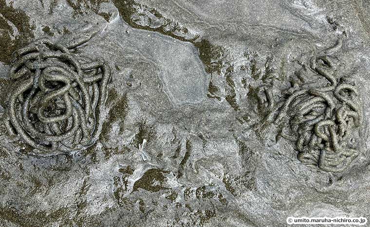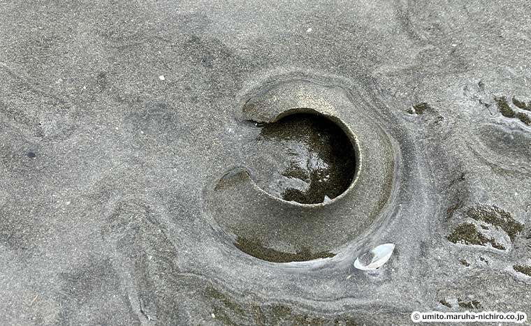 潮が引いたときに砂泥地を歩いていると、砂が渦巻きのようにぐるぐるしている場所がたくさんありました。これはタマシキゴカイのフンです。タマシキゴカイは砂を食べてその中の有機物を消化し、残った砂をフンとして積み上げます。海をきれいにしてくれる大切な存在ですね。