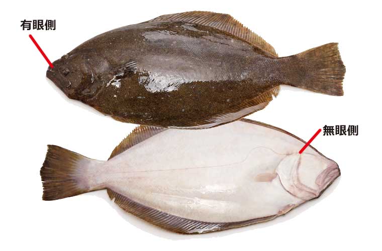 (有眼側:ヒラメを上からみたところ 無眼側:ヒラメを下からみたところ)
