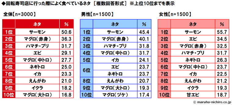 (「回転寿司店に行った際によく食べているネタ (複数回答形式)」アンケート)