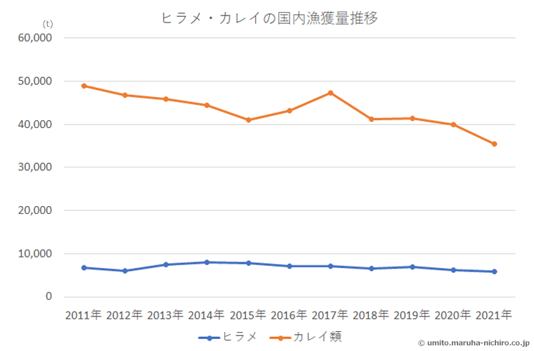 ヒラメは国内漁獲量が年間約6,000トンと少なく、高級品とされています。一方、カレイの国内漁獲量は年間約35,000トンとヒラメの約6倍です。ヒラメよりは安価で、比較的手に入れやすいのですが、国内漁獲量は減少しており、国内産のカレイは海外産に比べると希少で、価格が高くなっています。