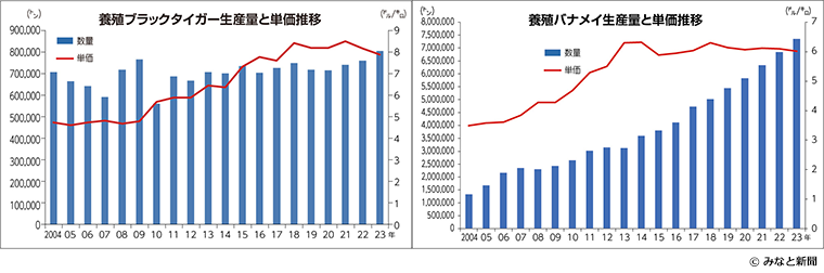 (生産量と単価推移 左:ブラックタイガー 右:バナメイエビ)