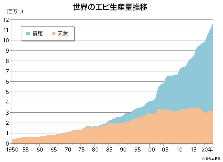 その後、天然エビは約300万トンで推移していますが、養殖エビは2022年には920万7,950トン、2023年には932万7,935トンと、右肩上がりの生産量が続いています。