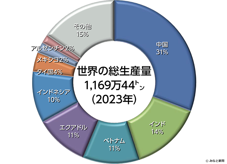 バナメイエビは、1990年代に中国などのアジア諸国で養殖が広がり、2000年以降に中国南部から東南アジアにかけて爆発的に生産量が増えました。現在もバナメイエビの国別生産量は中国が一位です。