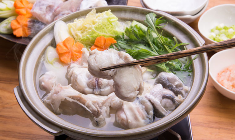 山口県下関市と福岡県を中心に親しまれる「ふぐちり」は、トラフグ(Takifugu rubripes)を使った高級鍋料理の代表格です。下関地域では、縁起を担いで、ふぐのことを福にちなんで“ふく”と呼びます。また、「てっぽう」(当たると死ぬ)という俗称から「てっちり」とも呼ばれるようになりました。フグの身を野菜などと一緒に昆布だしで煮て、紅葉おろしとポン酢で味わいます。