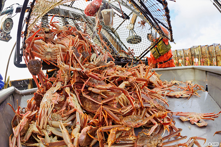 こちらはアラスカの、カゴ漁で漁獲したズワイガニを船に上げる様子です。