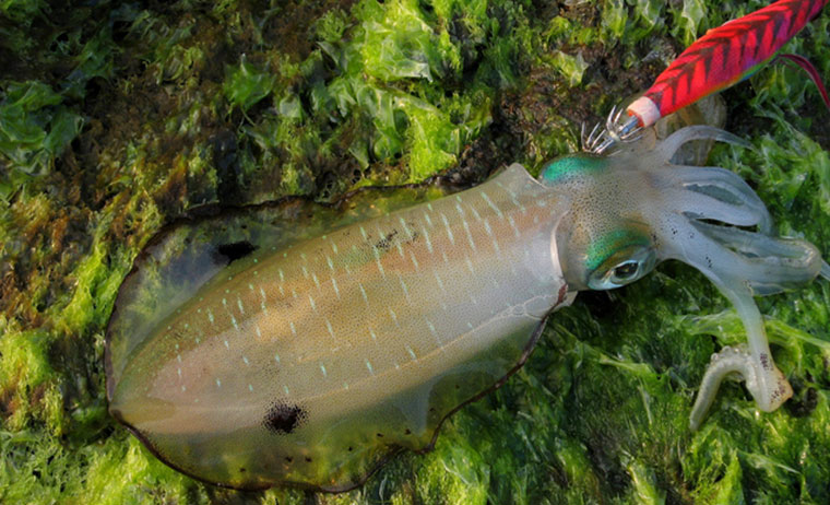 アオリイカ:歯ごたえ・甘み・旨味など、イカの刺身においてもっとも美味と評されています。漁獲量が少ないため、産地以外のスーパーで見かけることはあまりありません。疑似餌(エギ)に抱きつかせる独特な釣り方「エギング」でも人気のあるイカです。エギングは300年ほど前の鹿児島・奄美地方で生まれたといわれています。
