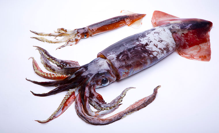 スルメイカ:日本周辺に広く生息しており、日本での水揚げ量の7割はスルメイカです。私たちに最もなじみ深いイカといえます。刺身、天ぷら、煮つけ、干した加工品・スルメなど、喫食方法も様々です。