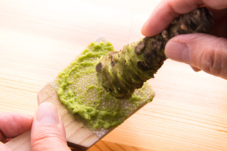 サメやエイの背皮で作られる鮫皮は、皮歯(ひし)と呼ばれる粒の配列が特徴的。生わさびをサメ皮のおろし板でおろすと、香り高く、まろやかな風味になると言われています。