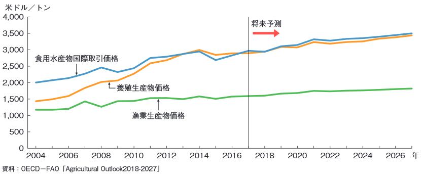 「世界の水産物価格の推移」のグラフでは、今後水産物の中長期的な価格の上昇が予測されています。新興国で新しい需要が生まれ、それが市場価格として定まってくると、新たな相場帯が形成されていきます。