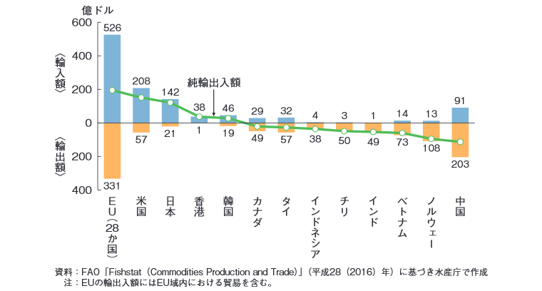 (水産白書 主要国・地域の水産物輸出入額及び純輸出入額)