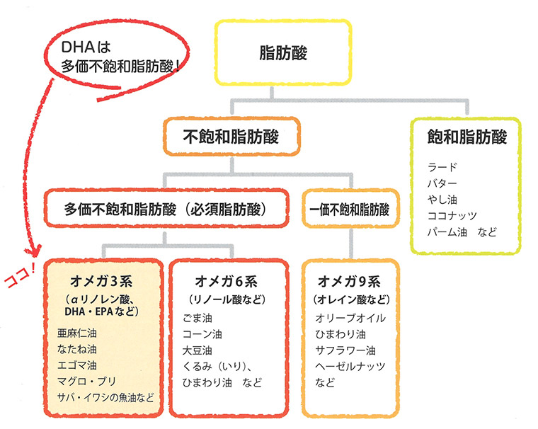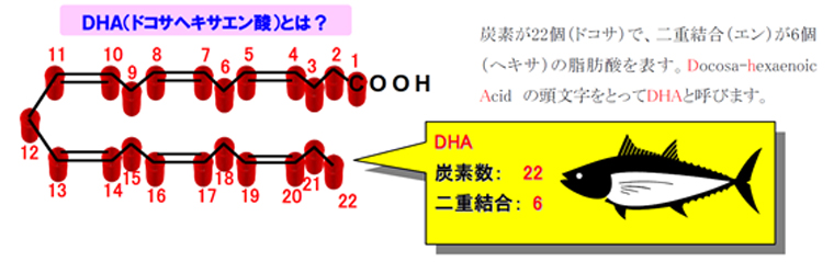 DHAはドコサヘキサエン酸(docosahexaenoic acid)、EPAはエイコサペンタエン酸(eicosapentaenoic acid)、の略で、前述の通り、食事からの摂取が必要な多価不飽和脂肪酸です。