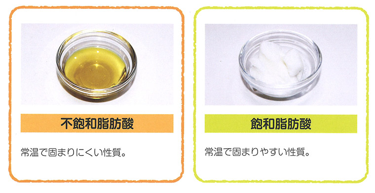 飽和脂肪酸は融点が高く、常温では固体で存在します。また、分子の構造により酸化しにくく、熱に比較的安定していると言われています。一方、不飽和脂肪酸は常温では液体で、また酸化しやすい物質です。