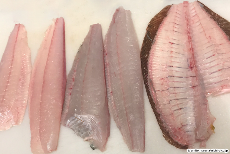 サバやアジのような魚は「三枚おろし」といって、両側の身と真ん中の骨の三枚に切り分けます。これに対してヒラメは、背中と腹側からそれぞれ二枚ずつの身を取り、残った骨の数を合わせた五枚に切り分けた「五枚おろし」というおろし方を用います。
