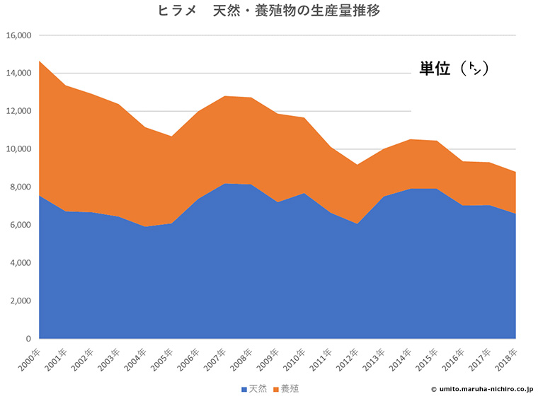 ヒラメの天然ものと養殖ものの生産量推移をグラフにしてみました。日本では様々な魚種で漁獲量の減少傾向が見られますが、ヒラメの天然ものについては、水揚量が全体では安定していることが見てとれます。