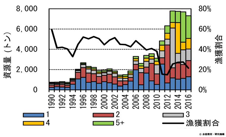 上のグラフでヒラメ(太平洋系群 南部・宮城・福島・茨城)の資源量推移を見てみます。2011年に1歳だったヒラメが、2012年には2歳、2013年には3歳となっています。東日本大震災の影響で一時的に漁獲割合が減り、獲られなかったヒラメが資源量全体の増加を支えていることがわかります。