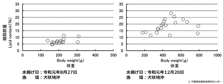 例えばマサバの脂肪分は、漁獲される時期により異なります。下図の通り、右側の冬(12月)に水揚げされたマサバは粗脂肪量が20%を超える個体が増えますが、左側の夏(8月)は15%を下回っています。