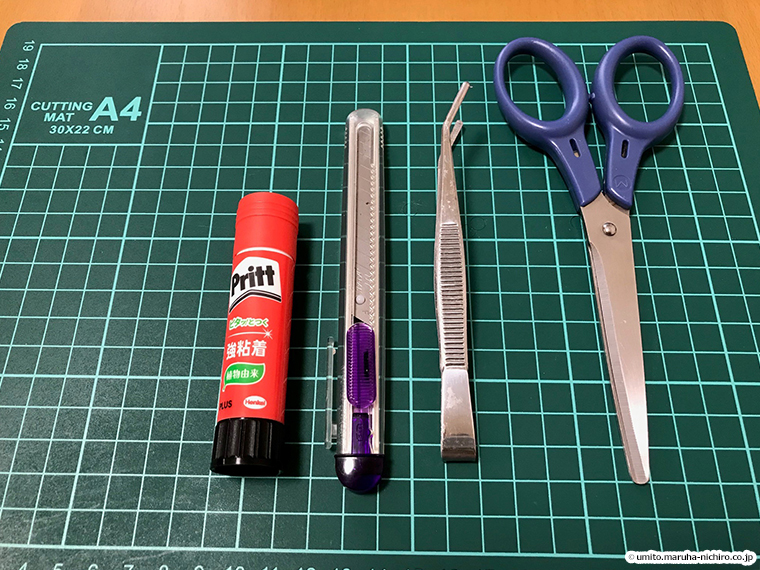 使用する道具は、ハサミ、糊、ピンセット、カッター、カッティングシートです。