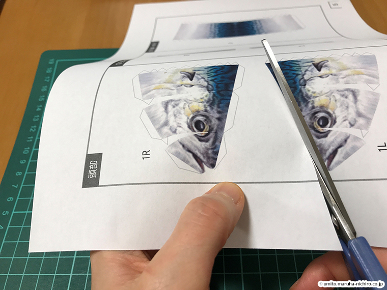 缶詰の製造工程では、頭や尾、内臓などは取り除き、切り身部分のみが缶に詰められています(ペーパークラフトでも再現されています)。切り落とされた部位は、養殖マグロのエサなどに有効活用されています。