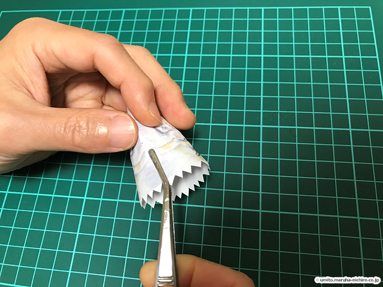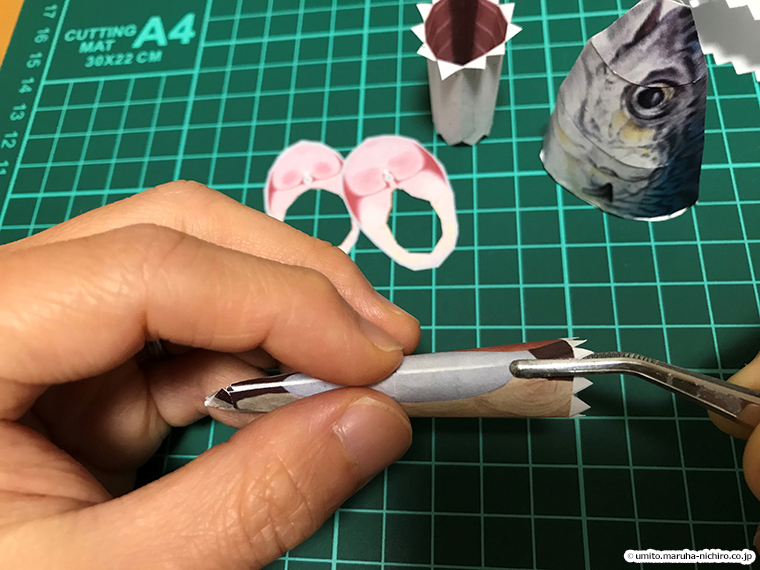 貼り合わせた部分をピンセットでおさえ、しっかりと接着させます。