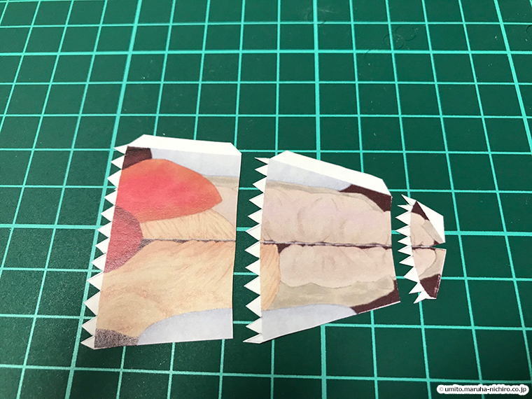 頭のギザギザののりしろの部分を90度内側に折り、糊をつけて7ページ目の「内臓11」を貼り付けます。